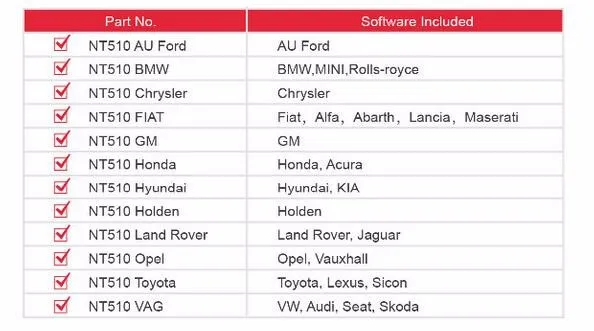 Foxwell NT510 Support cars: 1. For Chrysler 2. For G.M 3. Honda, Acur.a 4. For Hyundai, KIA 5. For Toyota, Lexus, Sicon 6. For Land Rover, Jaguar 7. For Opel, Vauxhall 8. For VW, Audi, Seat, Skoda 9. For BMW 10. For FIAT 11. For Ford For this scanner, For VW, Audi, Seat and Skoda is free. If you need the scanner supports other cars, you have to purchase for car softwares.