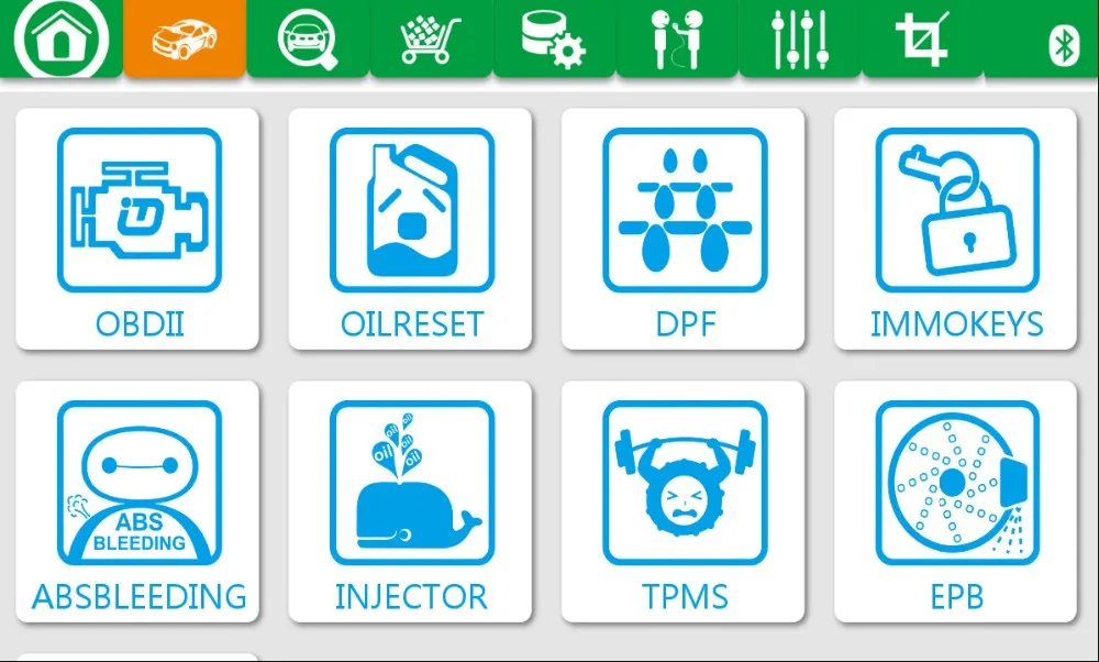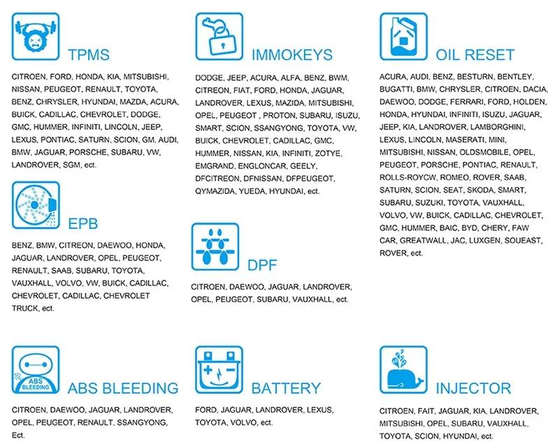 Powerful functions like OIL RESET, DPF, BATTERY, ABS BLEEDING, EPB, TPMS, IMMO KEY, INJECTOR, covering most of car makers including American, European, Asian, Australian and Chinese vehicles.